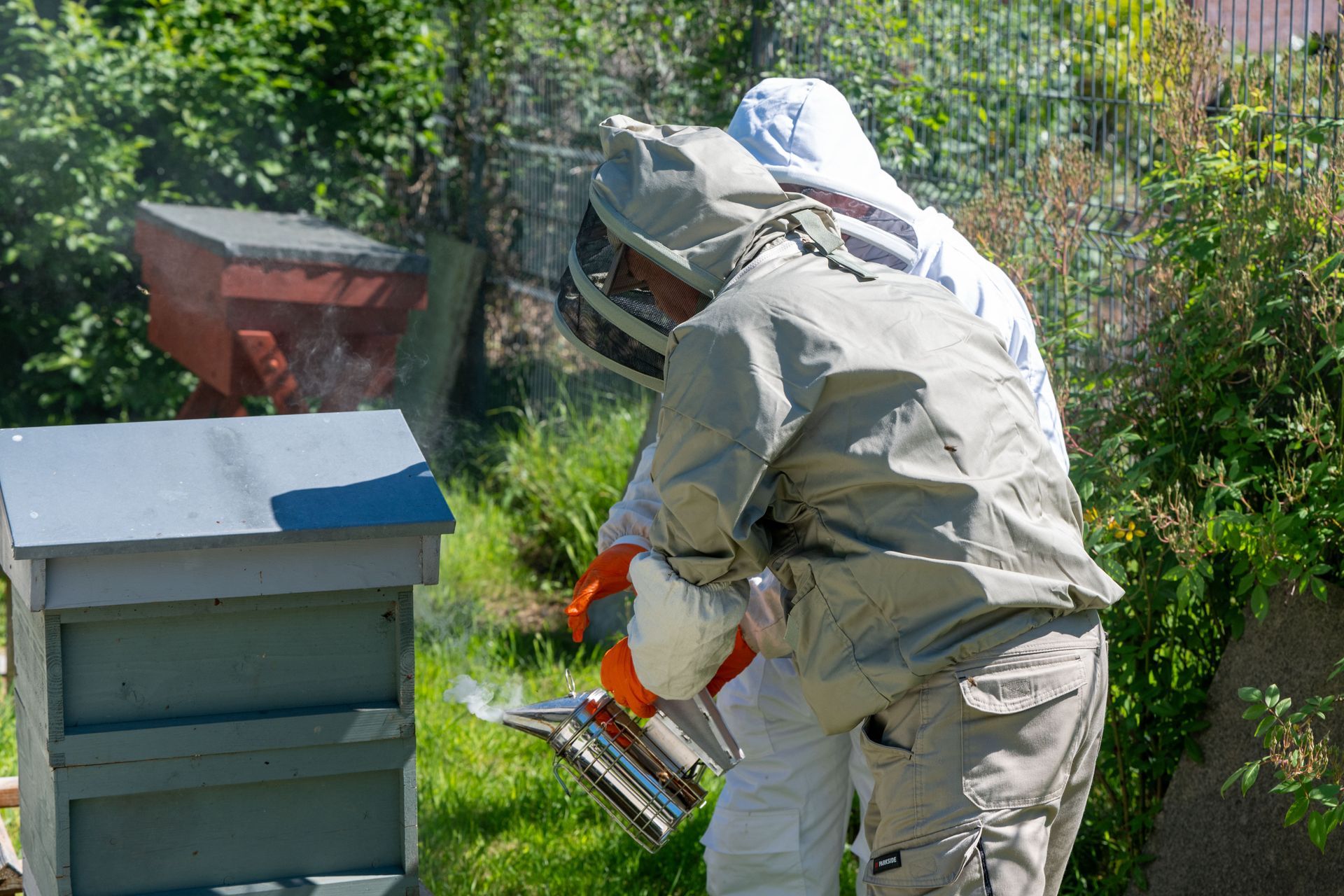 Carefully smoking the hives before inspection to keep the bees calm and cooperative 🔥🐝