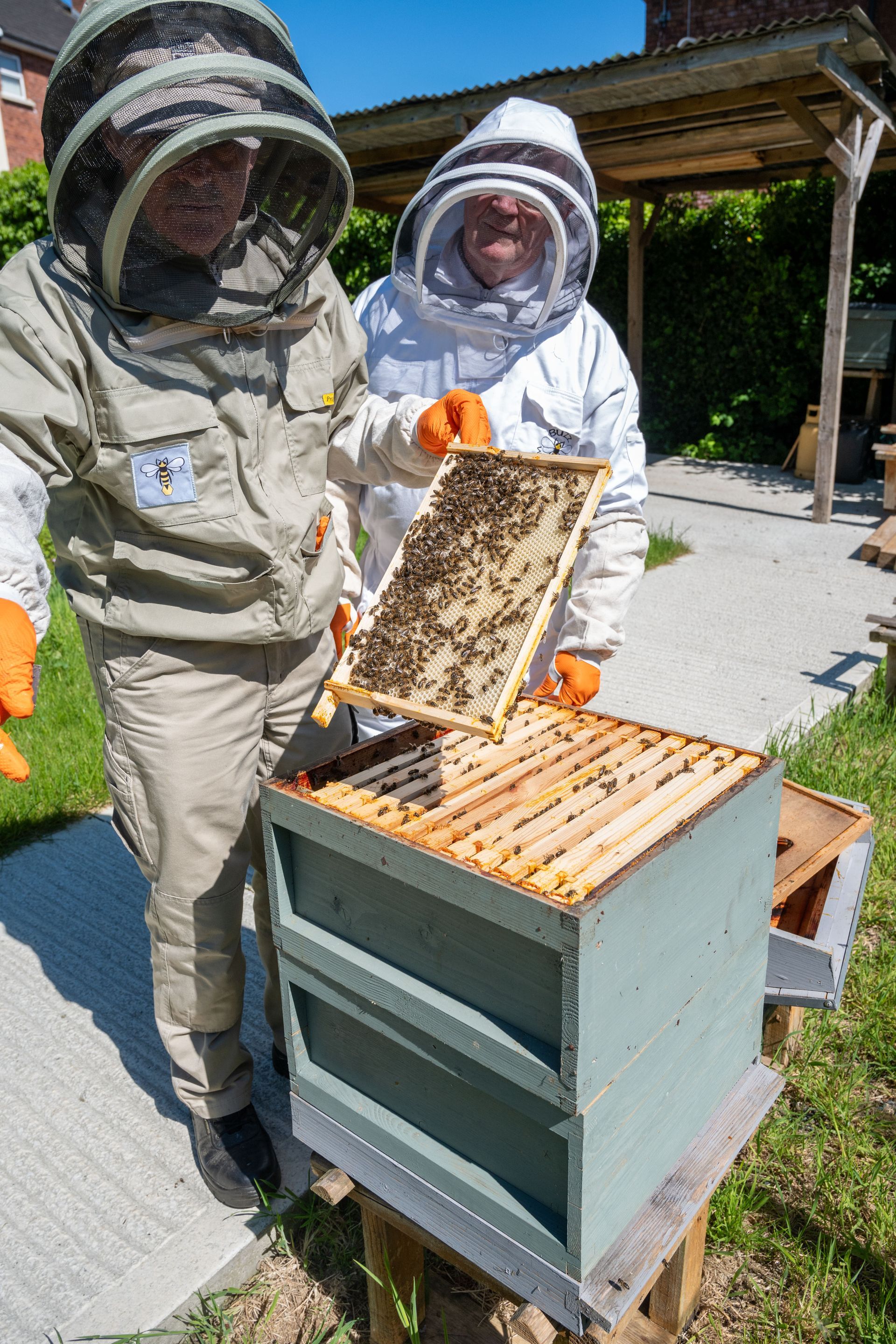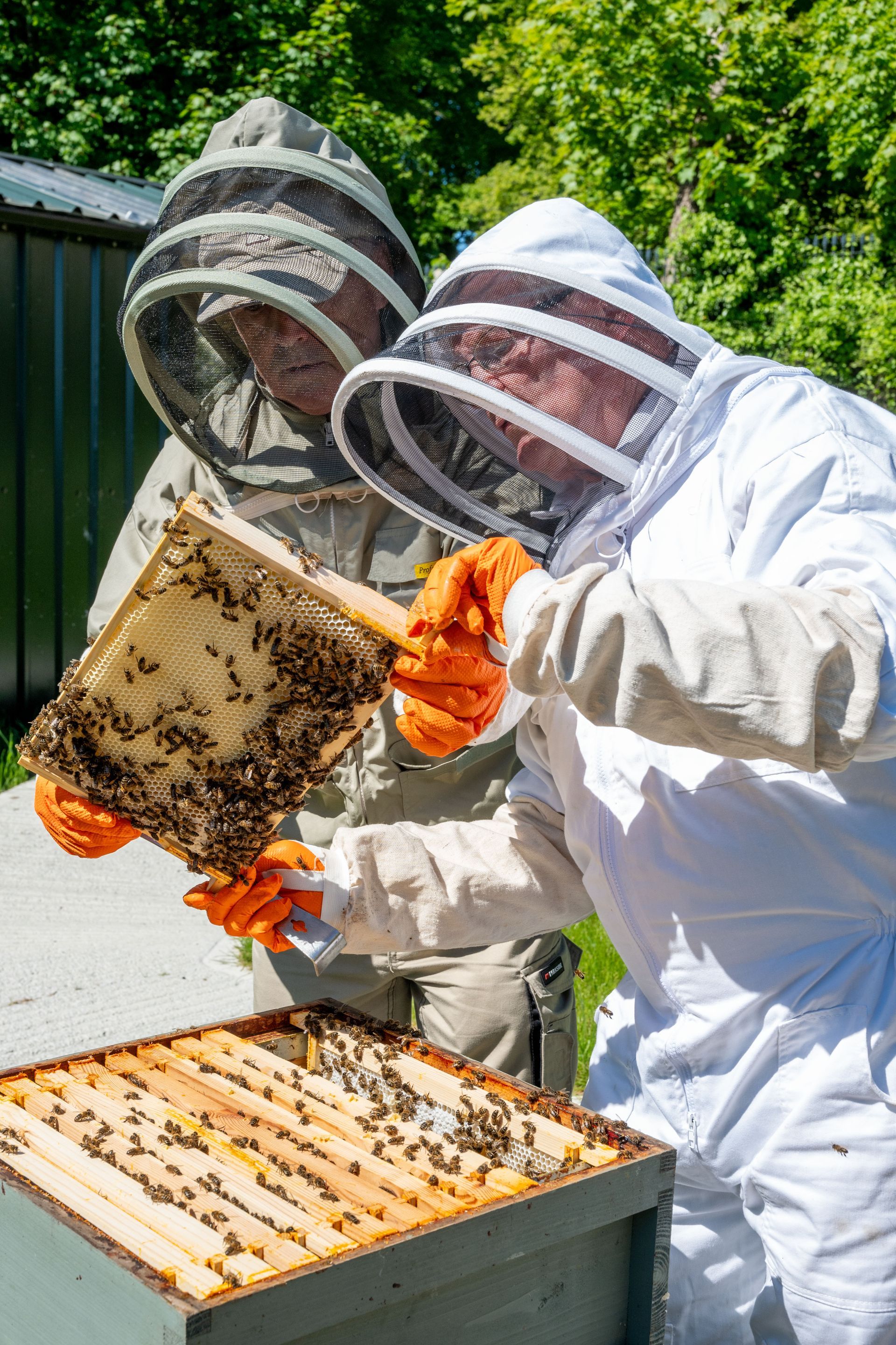 A lovely teaching moment with Barney guiding one of our new members on how to spot eggs and brood – vital signs of a healthy, growing colony
