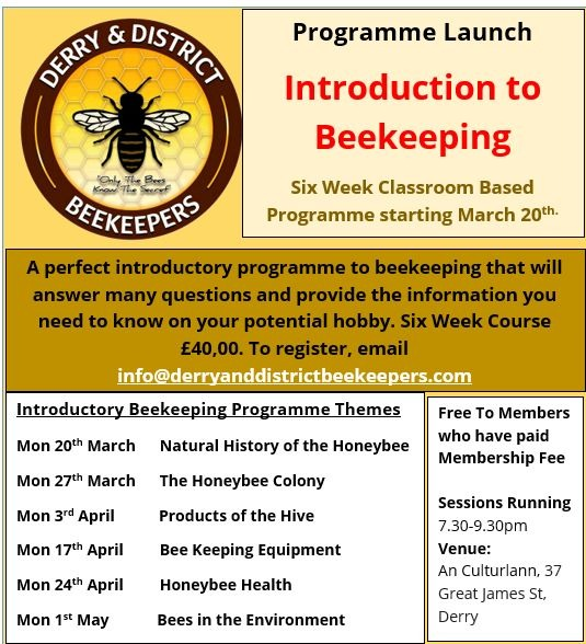 To register your interest for the course please contact : info@derryanddistrictbeekeepers.com, or go to our application form and follow the instructions of how to register/pay