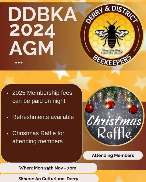 The first DDBKA talk of 2024 will be at 7.30pm on the 28th Feb 2024 in An Cultúrlann, Great James Street, Derry. The talk will be about 'Preparations for the new beekeeping season'.